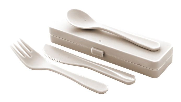 Set de tacâmuri, 3 bucăți, din plastic PP, în cutie de culoare asortată. Include furculiță, cuțit și lingură.