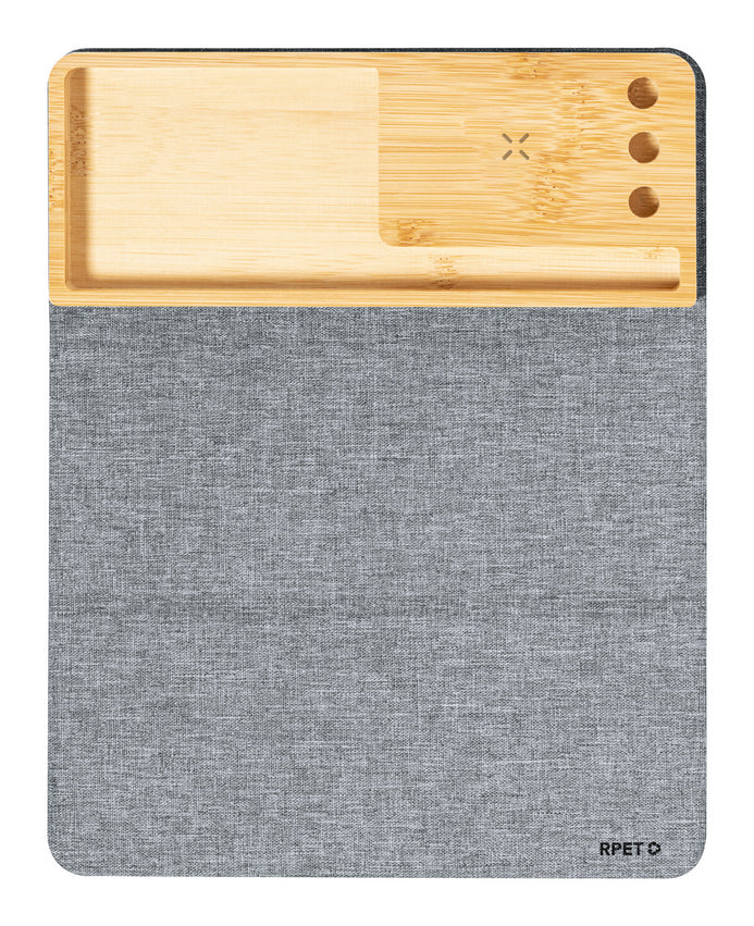 | Descriere | Mousepad pliabil, din poliester RPET, cu bază din silicon. Cu încărcător rapid fără fir încorporat (15W) și suport din bambus pentru telefon mobil. Poliester 300D RPET. Inclusiv cablu de încărcare USB. |