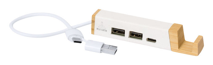 | Descriere | USB hub in recycled milk carton and bamboo, with mobile holder function. With 2 USB and 1 USB-C ports, USB 2.0. Including cable with USB and USB-C connections. |