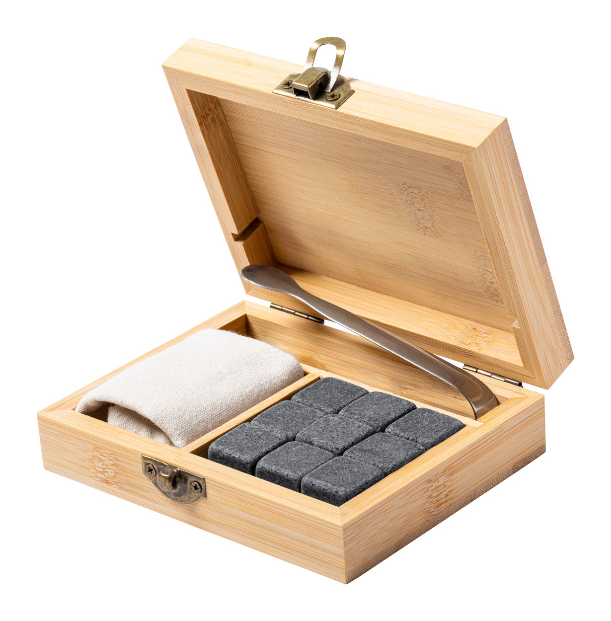 Set de cuburi de gheață din piatră, reutilizabil, în cutie de bambus. Include 9 cuburi de gheață de piatră, o pungă de depozitare din bumbac și clești din oțel inoxidabil.
