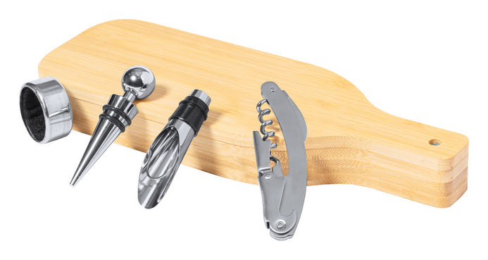 | Descriere | 4 pc stainless steel wine set in bottle-shaped bamboo box. Including corkscrew, drop stopper, nozzle and plug. |