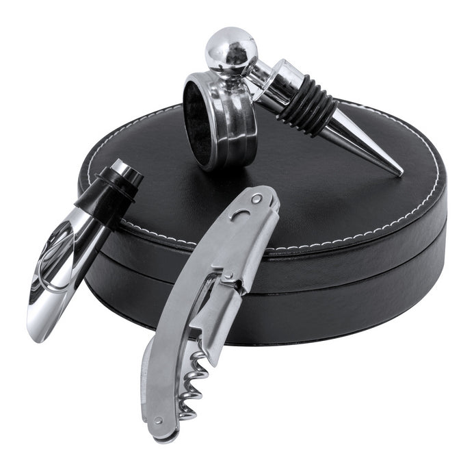| Descriere | 4 pc stainless steel wine set in elegant PU leather box. Including corkscrew, drop stopper, nozzle and plug. |