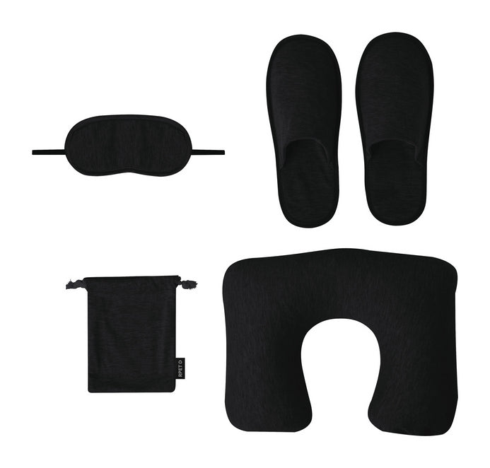 | Descriere | Set de călătorie, din poliester, în husă cu șnur din poliester RPET. Inclusiv pernă de călătorie gonflabilă, mască pentru ochi și papuci într-o singură mărime (36-43). |