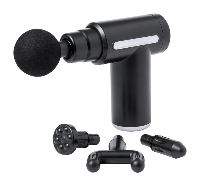 Pistol de masaj, din plastic ABS, cu 2 moduri și 4 capete de masaj. Cu baterie reîncărcabilă încorporată (800 mAh). În pungă din poliester RPET. Inclusiv cablu de încărcare USB.