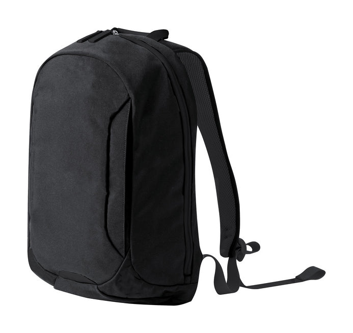 600D polyester backpack with zipped compartments, padded laptop (15") and tablet (10") compartment, padded back and shoulder straps.