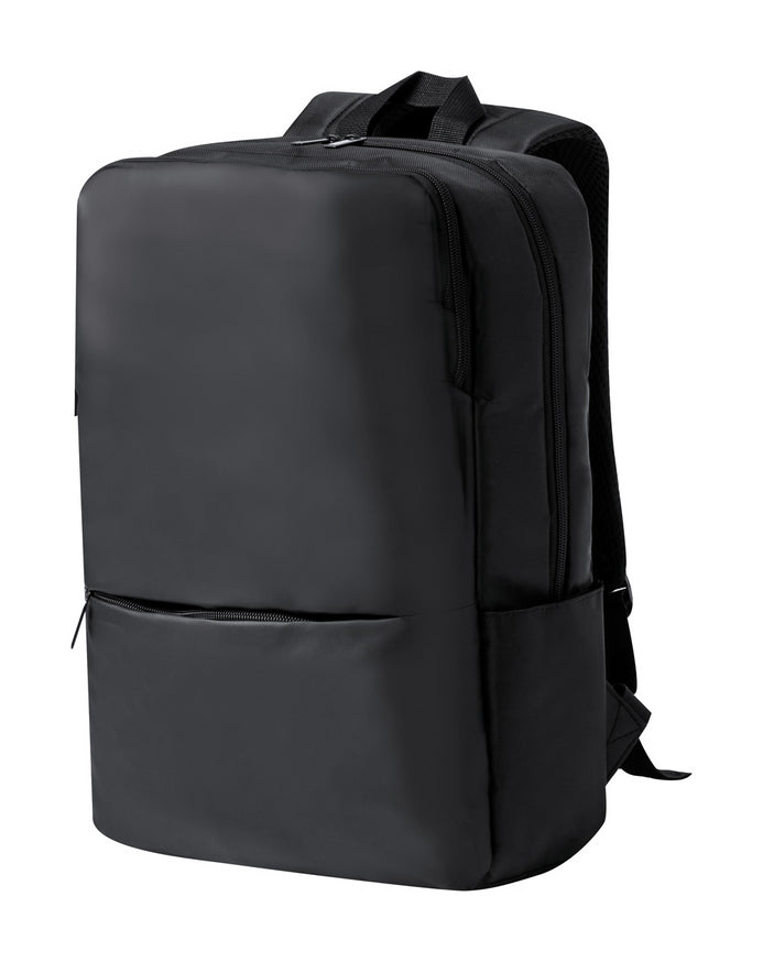 PU leather and polyester backpack with zipped compartments, padded laptop (15") and tablet (10") compartment, padded back and shoulder straps.