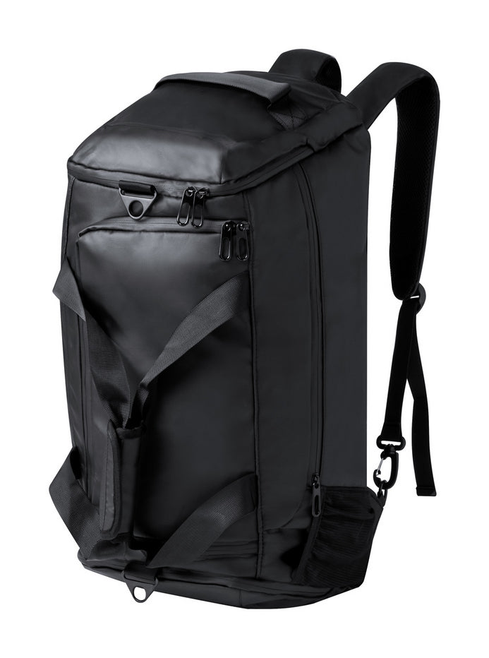 PU leather backpack that can also be used as handbag or shoulder bag. With zipped compartments, side and mesh pockets, shoe compartment, padded back and shoulder straps. With front carry handles.