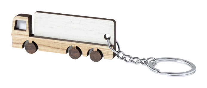 | Descriere | Breloc din lemn, în formă de camion, cu inel metalic și finisaj bicolor. |