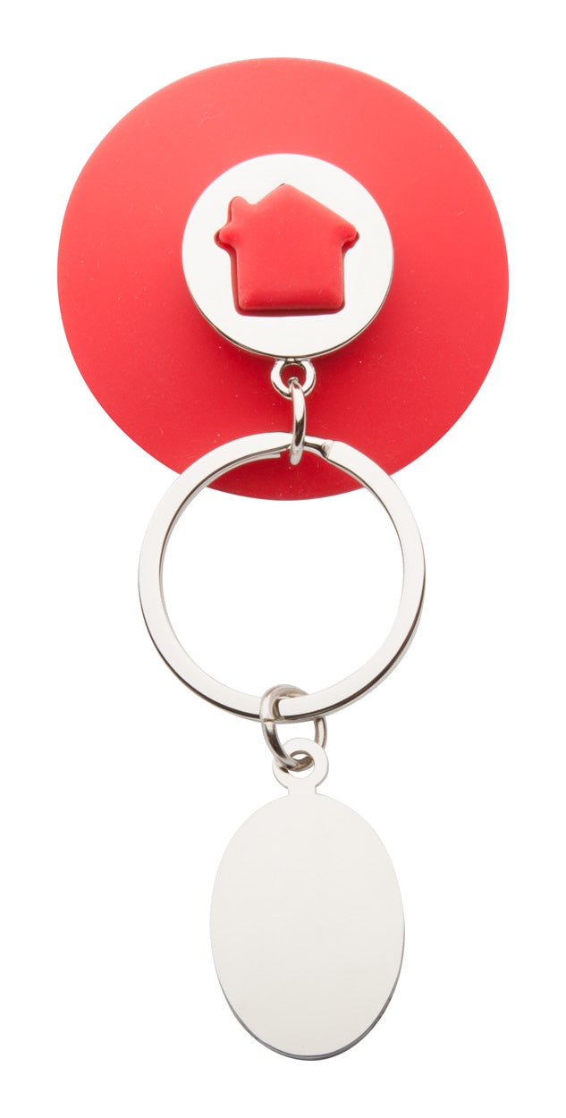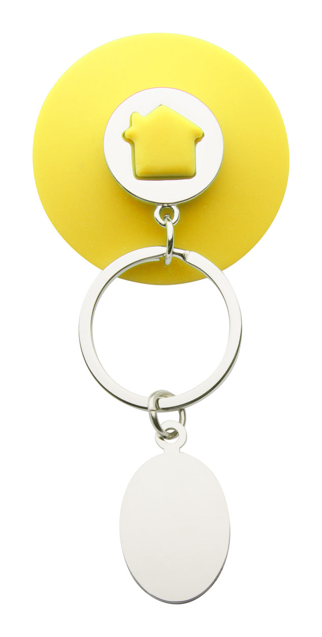 Breloc metalic cu ventuză din silicon, în formă de casă.