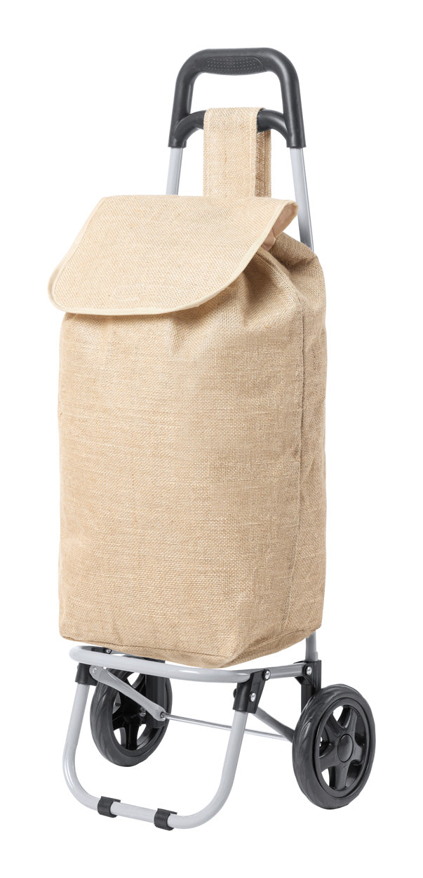 | Descriere | Cărucior de cumpărături pliabil, din iută, cu cadru metalic, buzunar cu fermoar pe spate, roți și mâner întărite. |