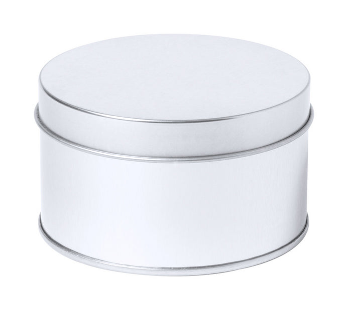 Cutie cadou rotundă, din metal, cu finisaj argintiu.