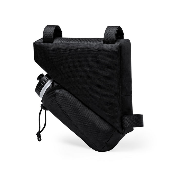 Geantă cadru de bicicletă din poliester 600D cu căptușeală din PVC. Cu fermoar compartiment principal, suport pentru sticla sport și benzi scai reglabile pentru rama de bicicletă