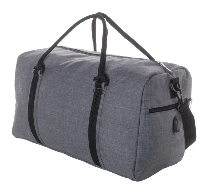 Geantă sport cu fermoar, curea de umăr și conexiune USB încorporată pentru power bank. Poliester 600D.