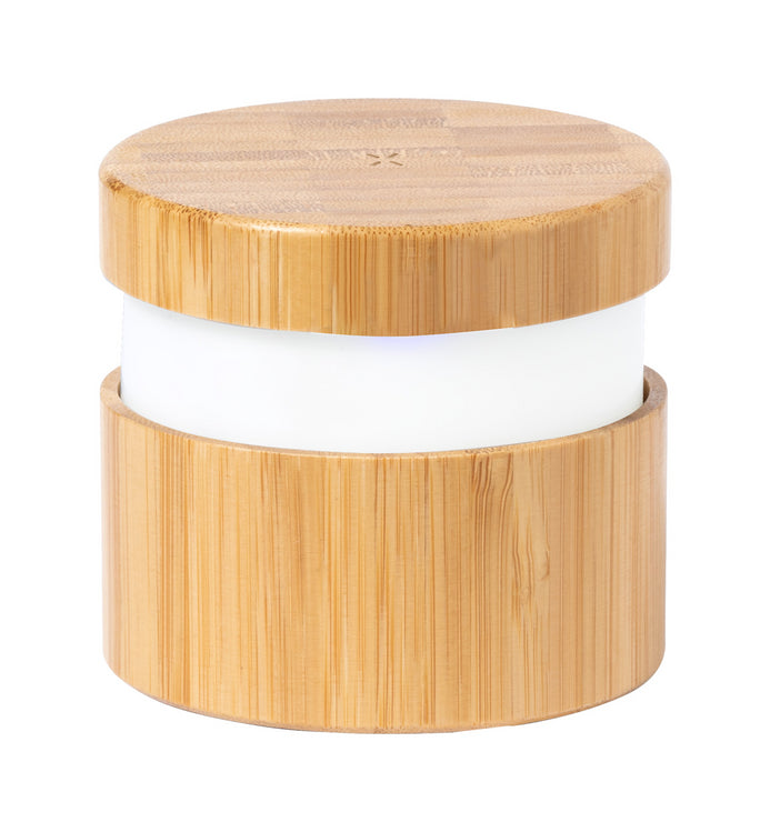 Difuzor Bluetooth, în carcasă din bambus, cu 2 lumini LED și încărcător rapid wireless (15W) în partea de sus. Cu funcție de apel hands-free și baterie reîncărcabilă încorporată (400 mAh). Inclusiv cablu de încărcare USB.