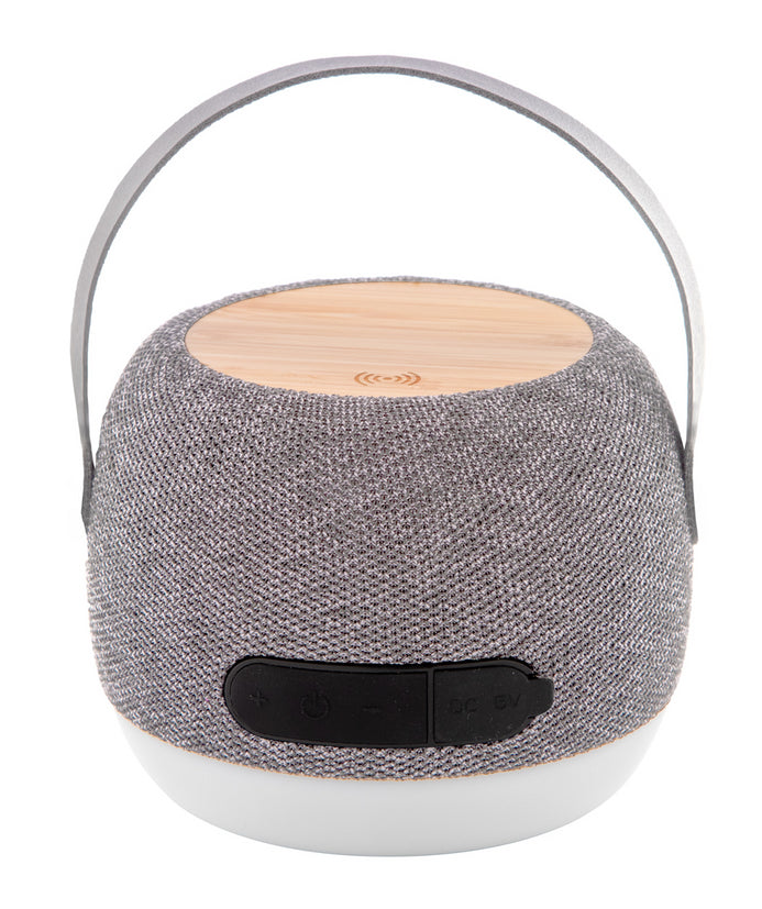 Difuzor Bluetooth din carcasă ABS reciclată acoperită cu material RPET, cu lumină LED în partea de jos și încărcător rapid fără fir (15W) cu placă de bambus în partea de sus. Cu curea de transport din piele PU, funcție de apel hands-free și baterie reîncărcabilă încorporată (1200 mAh). Inclusiv cablu de încărcare USB.