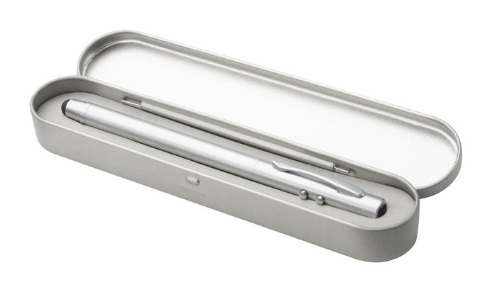 | Descriere | Laser pointer multifuncţional, cu pix, cu stylus pentru touch screen şi cu LED. În cutie de cadou metalică, se livrează cu baterii. |
