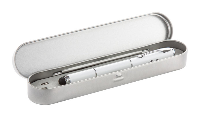 | Descriere | Pix laser pointer multifuncțional, cu vârf tuch screen și cu LED, în cutie metalică. Se livrează cu mină albastră și baterii. |
