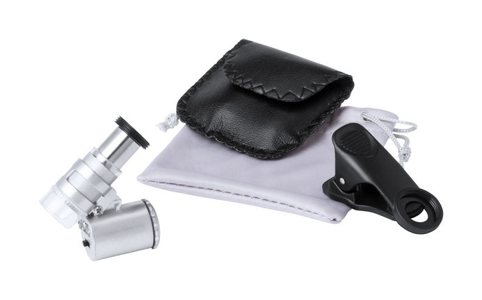 Microscop universal pentru telefoane mobile, putere mărire de 60x, lumină LED (detector bani). Cu baterii, în husă din înlocuitor piele. Material: ABS / metal.