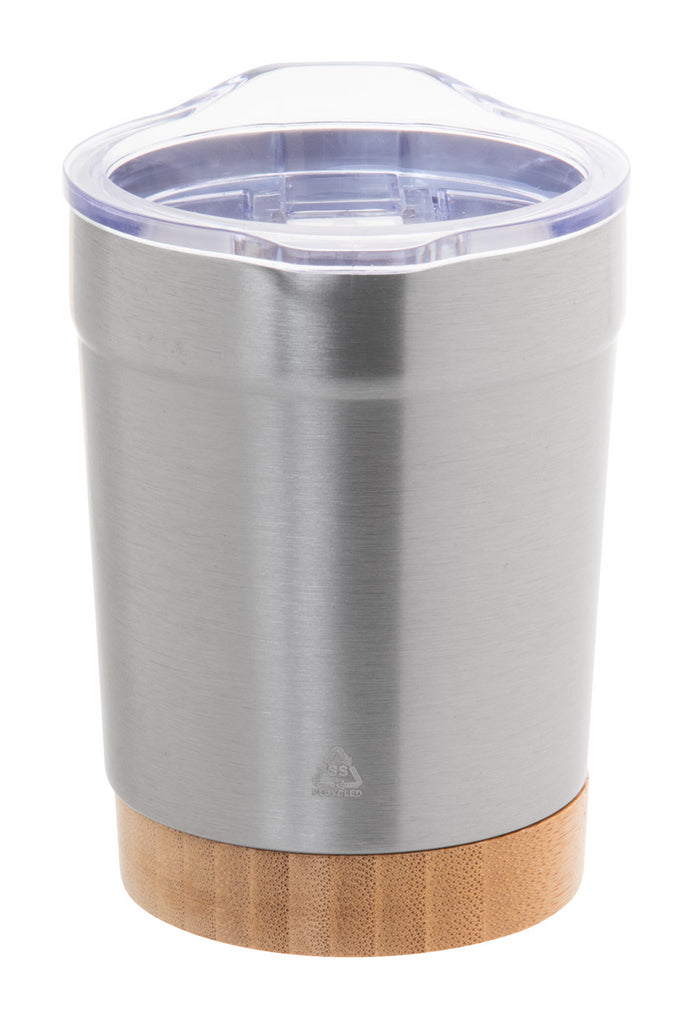 Descriere Cană termoizolată, din oțel inoxidabil reciclat, cu perete dublu, cu bază din bambus și capac pentru băut din plastic AS. 300 ml.