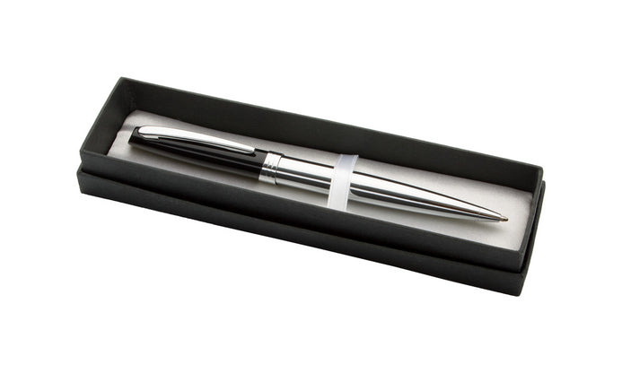 | Descriere | Pix metalic, capac negru lăcuit, corp şi clip cromat. În cutie de cadou, mină albastră. |