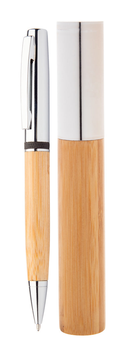 | Descriere | Pix elegant, cu răsucire, din metal, cu butoi din bambus și părți cromate strălucitoare. În carcasă din tub din bambus cu capac cromat. Cu reumplere albastră. |