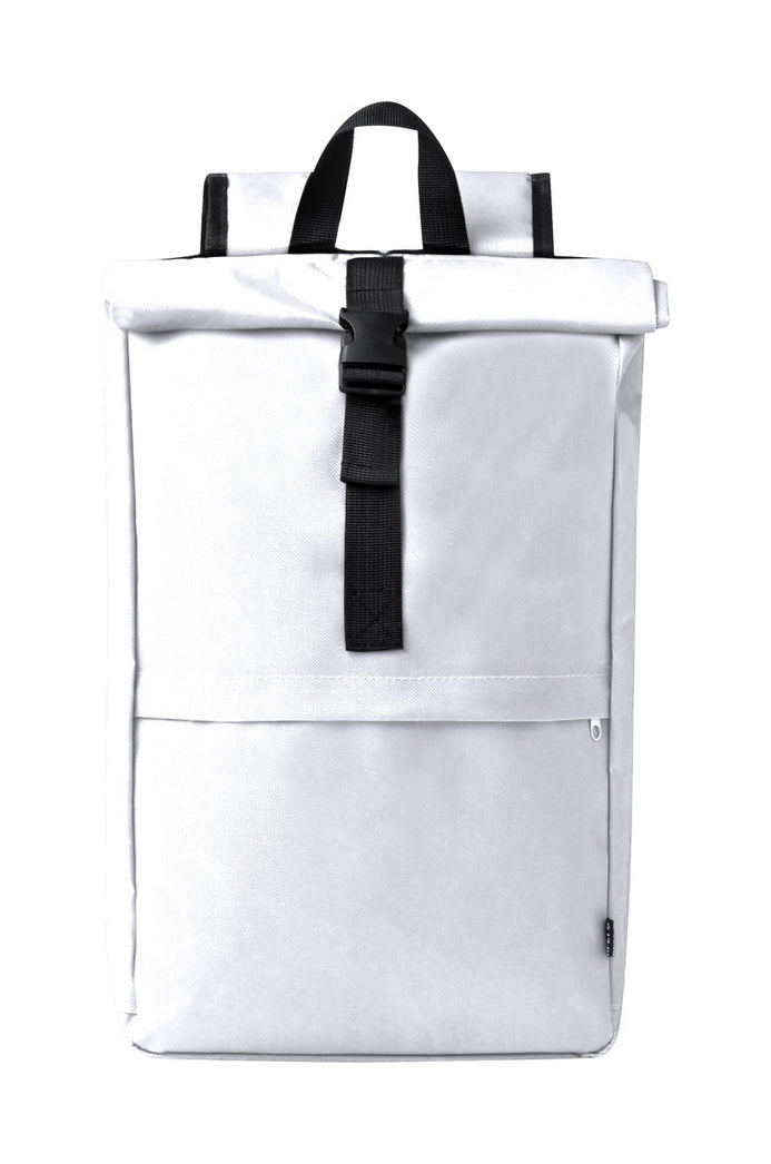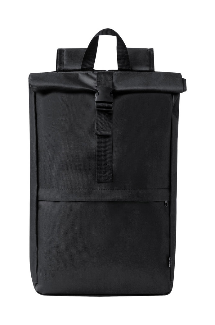 RPET rolltop backpack with buckle closure, zipped front pocket and compartments, padded back and shoulder straps. 600D RPET polyester with distinctive RPET label.