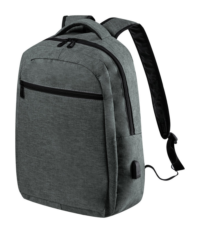 Rucsac cu compartimente cu fermoar, buzunar lateral cu plasă, compartiment căptușit pentru laptop (15 ") și tabletă (10"), spate și bretele căptușite. Cu conexiune USB încorporată pentru power bank. Poliester 600D.