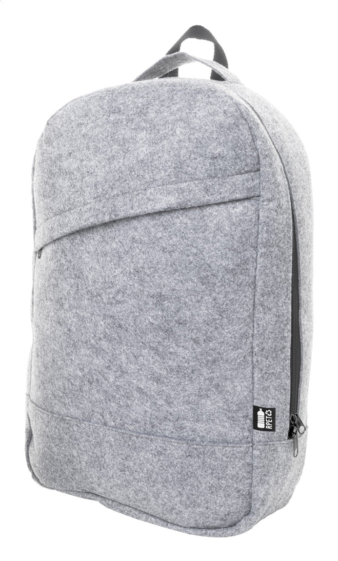 Rucsac din fetru RPET, cu compartiment principal cu fermoar și buzunar frontal. Cu compartiment pentru laptop (15"), curea pentru cărucior și curele de umăr căptușite. Cu etichetă distinctivă RPET.