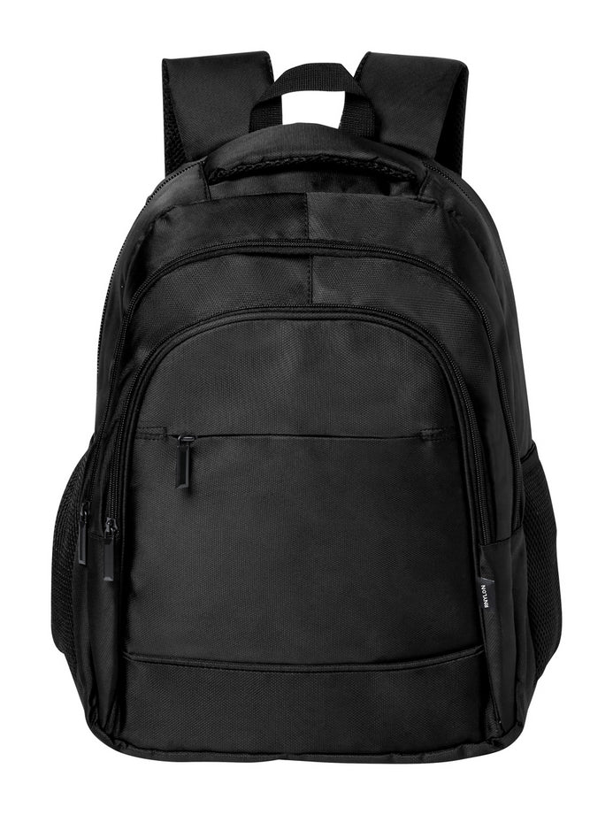 Rucsac RNYLON cu mai multe compartimente cu fermoar, buzunare laterale din plasă, buzunar căptușit pentru laptop (15"), curea pentru cărucior, spate și bretele ergonomice. Poliester 420D RNYLON cu etichetă RNYLON distinctă.