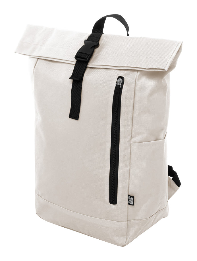 Rucsac RPET, cu închidere cu cataramă, compartiment pentru laptop (14") și buzunar frontal cu fermoar. Cu spate și bretele căptușite. Poliester 600D RPET cu etichetă distinctivă RPET.