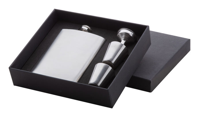Setul include o sticlă plată (230 ml), 2 pahare shot și o pâlnie. Din oțel inoxidabil. În cutie neagră de cadou.
