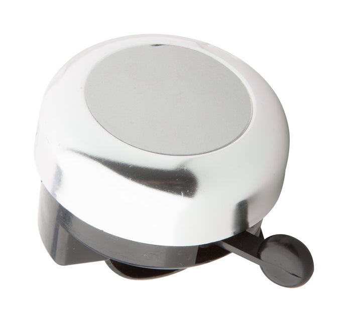 Sonerie bicicletă din aluminiu colorat, cu suprafață argintie pentru personalizare.