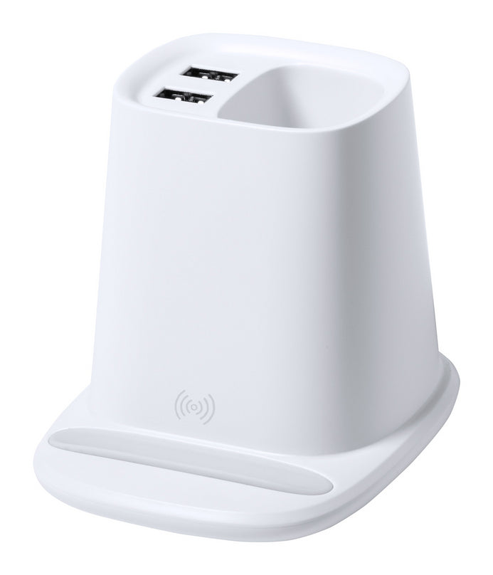 | Descriere | Suport de pixuri multifuncțional din plastic, cu suport pentru mobil, încărcător wireless ( maxim 1000mA) și 2 porturi de USB ( maxim 200 mA). Unul din porturile USB funcționează ca și USB hub ( USB 2.0). Include cablu încărcător USB |