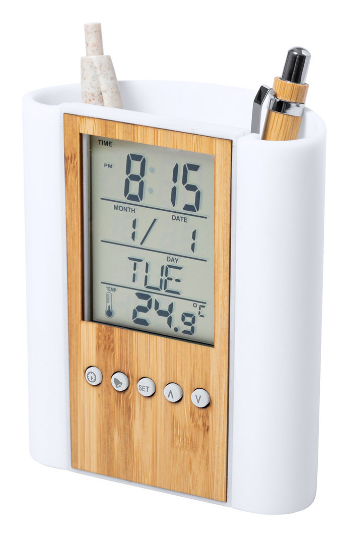 | Descriere | Suport de pixuri multifuncțional din plastic cu front din bambus și display digital. Funcții : termometru, ceas și dată, Cu baterii de ceas |