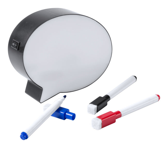 Tăbliță de scris mesaje cu 8 LED-uri, 3 carioci și ștergător. Funcționează cu 3 baterii AAA. Se livrează fără baterii.
