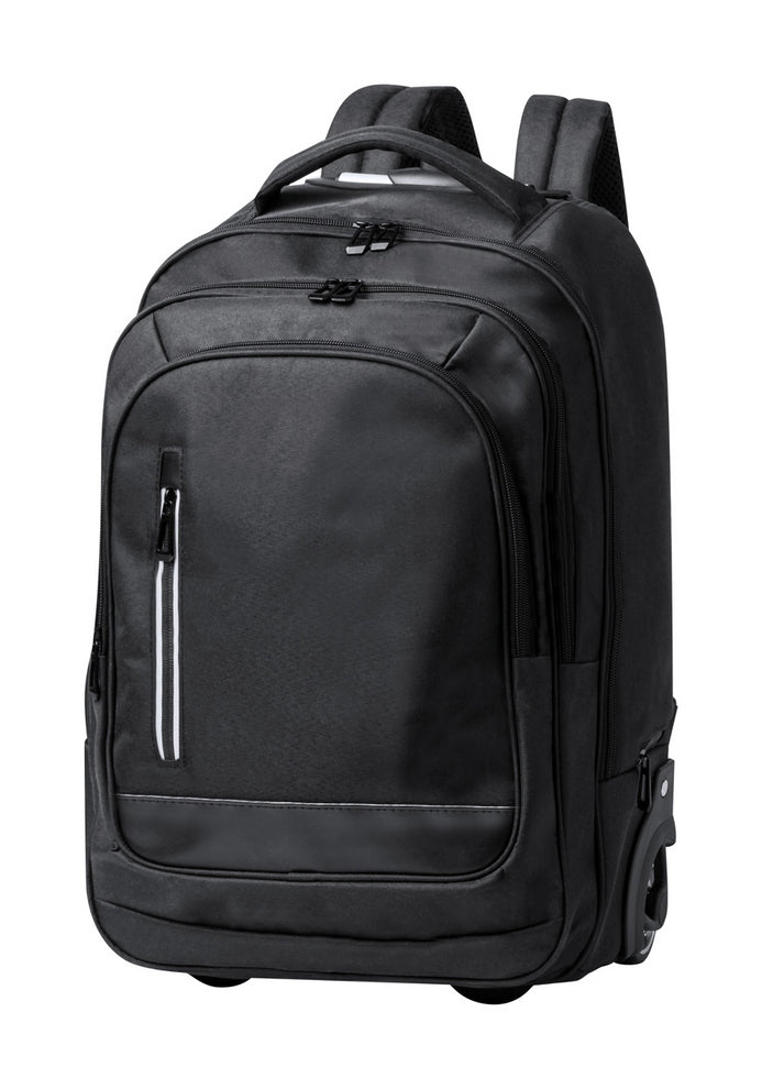 300D polyester trolley backpack with zipped compartments, 2 wheels and telescopic handle. With laptop (15") compartment, padded back and shoulder strap.
