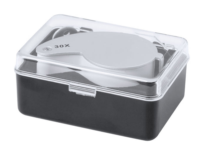 | Descriere | Foldable magnifier in ABS plastic and metal, with 2 LEDs. Including button cell batteries. |
