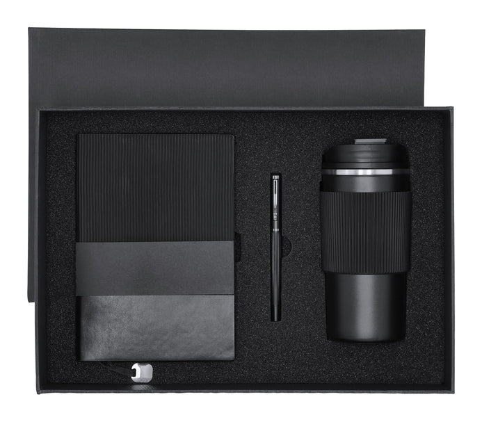 Set birou premium. Include: 1 agenda cu coperta din piele PU cu semn de carte și 100 de foi dictando; 1 stilou roller din aluminiu, mină albastră; 1 cană termo din oțel inoxidabil cu perete dublu, cu capac și bandă de silicon, 470 ml. Izolația menține băuturile calde timp de 3 ore și reci timp de 6 ore.