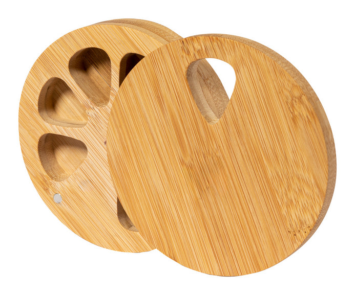 | Descriere | Cutie de pastile, rotundă, din bambus, cu 7 compartimente și închidere magnetică. |