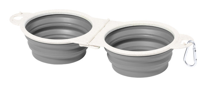 Bol pentru câini, pliabil, din plastic din paie de grâu și TPR, cu două compartimente și carabină.