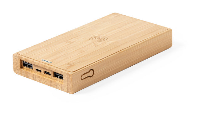 Baterie externă USB din bambus, cu încărcător wireless încorporat (5W), baterie de 10000 mAh și încărcător solar încorporat. 2 porturi USB pentru încărcător. Porturi de intrare micro USB și USB-C. Inclusiv cablu de încărcare USB. Fabricat din bambus din s