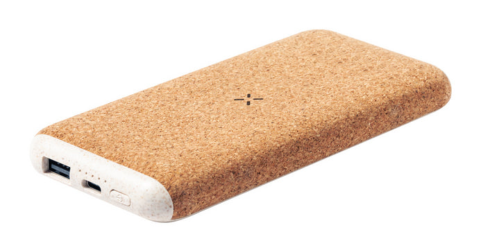 Baterie externă cu USB, din plută naturală și plastic din paie de grâu, cu baterie de 8000 mAh și încărcător rapid fără fir încorporat (15W). Cu 1 port USB și 1 port USB-C pentru încărcător. Port de intrare USB-C. Inclusiv cablu de încărcare USB.