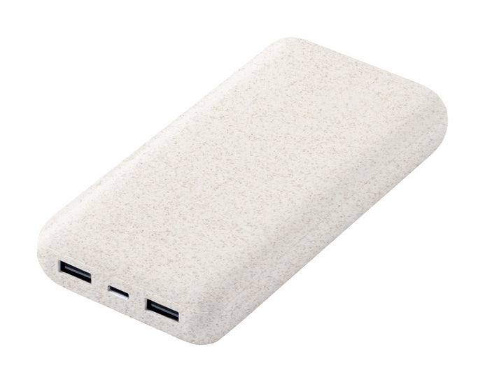 Baterie externă, din plastic ecologic din paie de grâu, cu capacitate de 20000 mAh. Cu 2 porturi USB și 1 USB-C pentru încărcător. Port de intrare USB-C. Inclusiv cablu de încărcare USB.