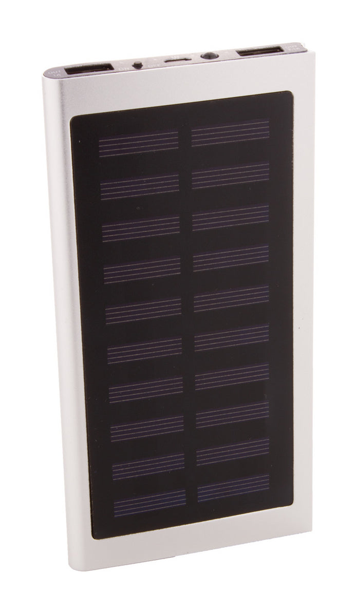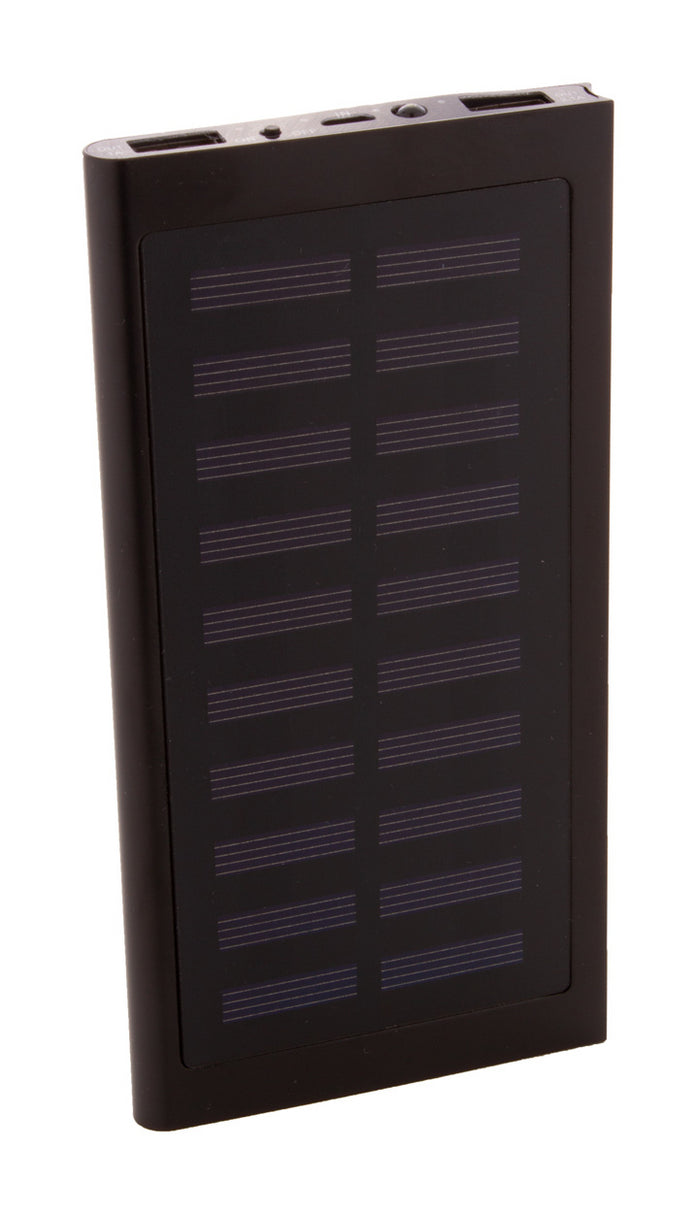 Baterie externă cu USB, în carcasă din aluminiu reciclat, cu încărcător solar încorporat și baterie de 4000 mAh. Cu 2 porturi USB și 1 USB-C pentru încărcător. Port de intrare USB-C. Inclusiv cablu de încărcare USB.