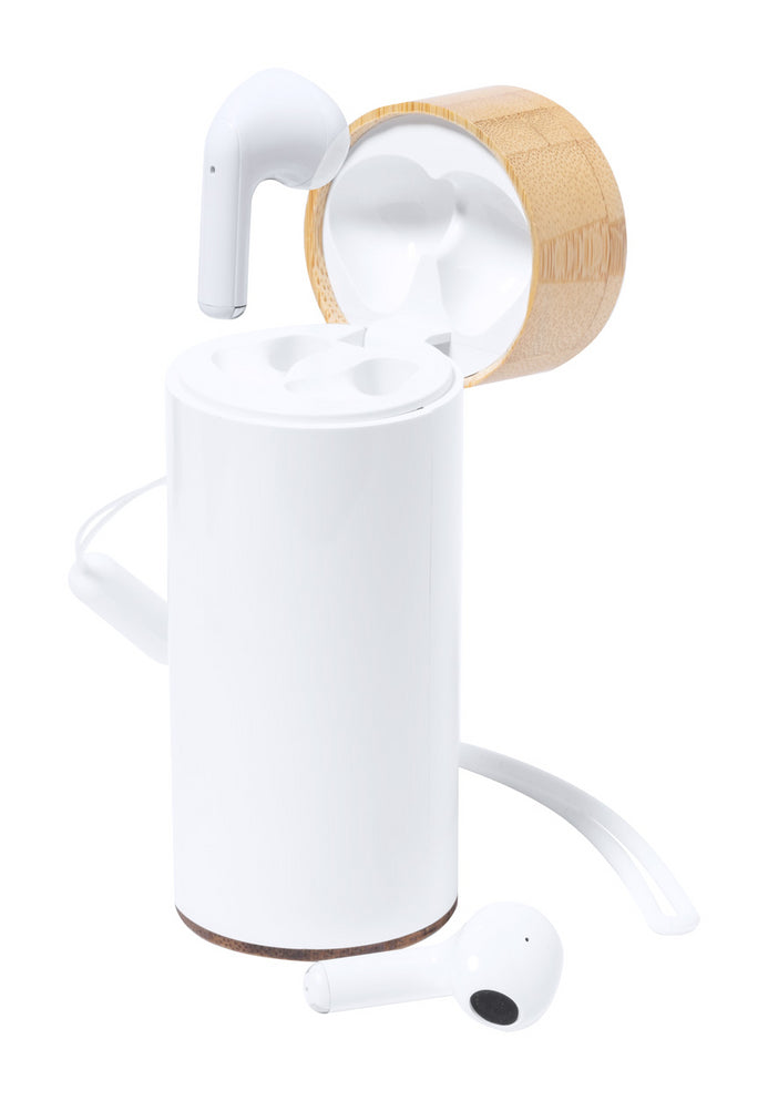 ABS plastic and bamboo power bank with 4500 mAh battery. Including bluetooth earphones with hands-free call function. Including USB charger cable.