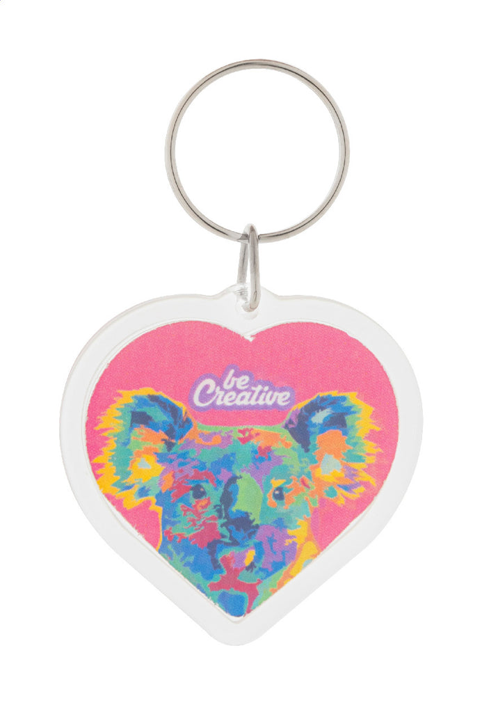 Breloc acrilic în formă de inimă, cu inserție de hârtie personalizată color și inel metalic. Prețul include imprimare digitală pe ambele părți. MOQ: 100 buc.