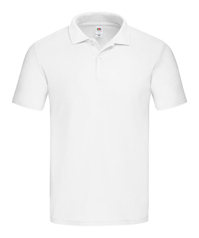 Tricou polo, pentru adulți, de culoare albă, cu 2 nasturi asortați. 100% bumbac piqué, 175 g/m². Produs marca Fruit of the Loom.
