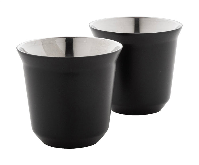 Set de 2 cănitermoizolante, pentru espresso, cu pereți dubli în formă de capsulă de cafea, din oțel inoxidabil reciclat, 80 ml. În cutie de hârtie kraft.