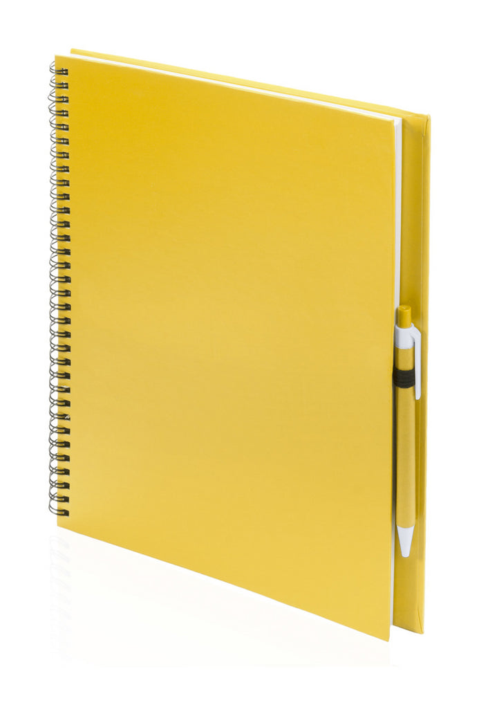 | Descriere | Blocnotes spiralat cu 80 file veline A4, copertă din caton, cu pix de aceeași culoare din carton reciclabil. Mină albastră. |