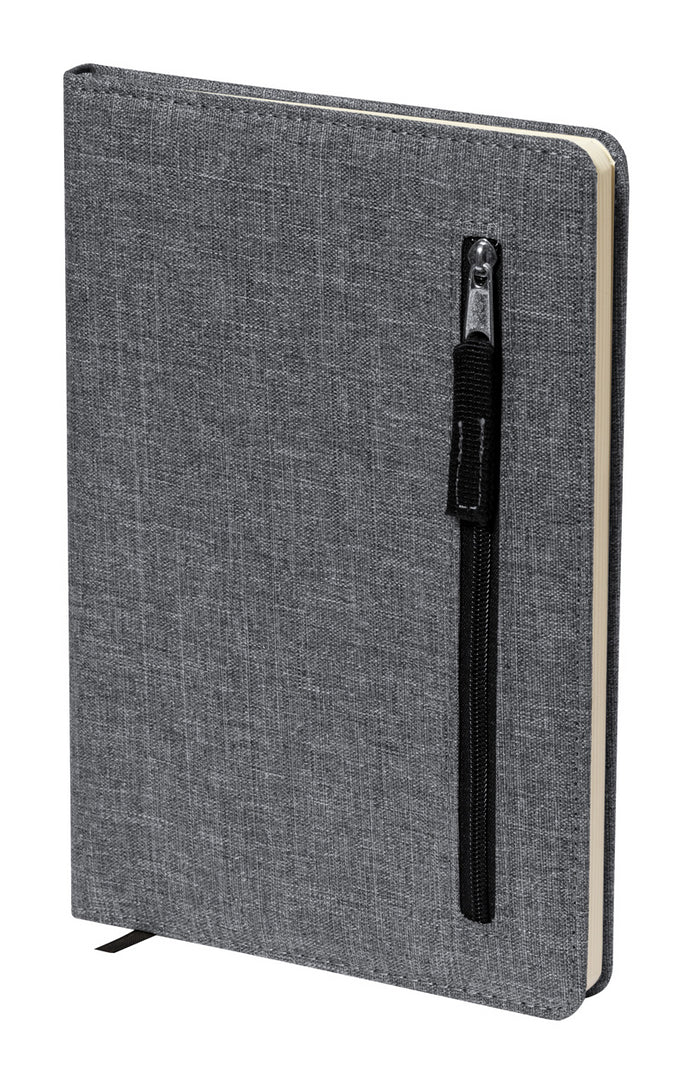 | Descriere | 300D RPET polyester covered notebook with zipped front pocket, bookmark and 100 lined sheets. A5 size. |
